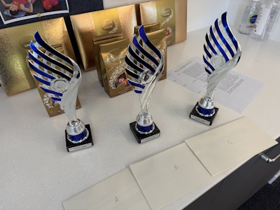 Fadlan Satria - Winner in ARex Shakespeare - Winner in BBill Doherty - Winner in CEileen Mills - Winner in DAngie, Trevor, Paula took out minor prizes. Absent: GlenAdi's first event today
