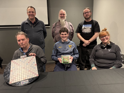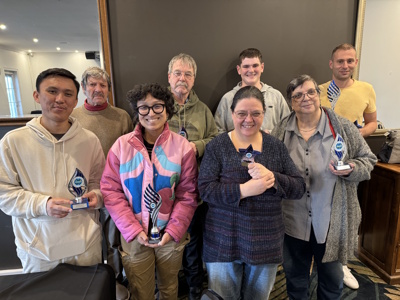 Division A Prize winners. Andrew (winner), David (runner-up, high word, and high game), and Oscar (3rd)The other prize winners in B. From L-R: Bobby (Rating band), Barry (High Game), Angie (Rating band), Geoff (winner), Paula (High Word), and Jenny (Runner-Up)Chris (3rd in B)